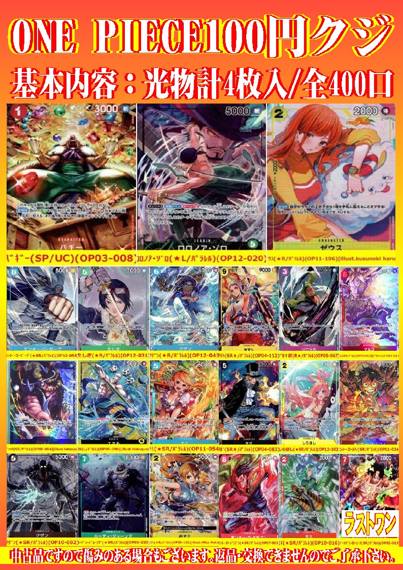 シーガル郡山店です。 ワンピ100円クジ作成致しました‼️ 全400口での販売となっております。 よろしくお願いします。