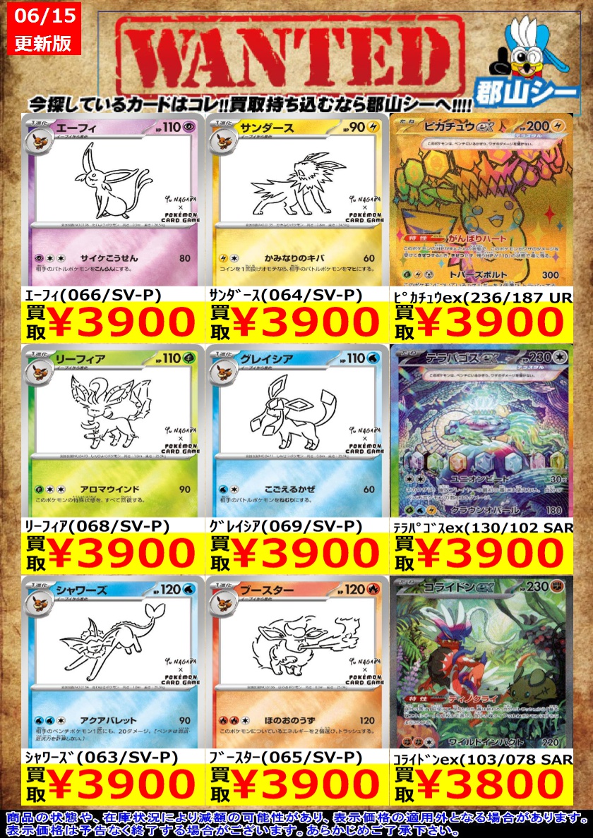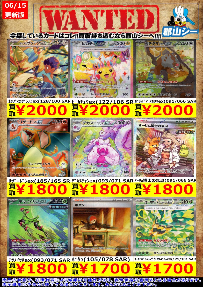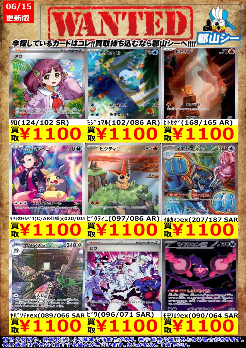 シーガル郡山店ポケカ数量限定お買取り情報更新です!よろしくお願いいたします! ※商品の状態や在庫状況により減額の可能性があり、表示価格の適用外となる場合がございます。 ゼクロムex(161/086 SR) ¥800 ヒビキのバクフーン(070/063 AR) ¥900 ナンジャモのカイデン(232/SV-P) ¥800
