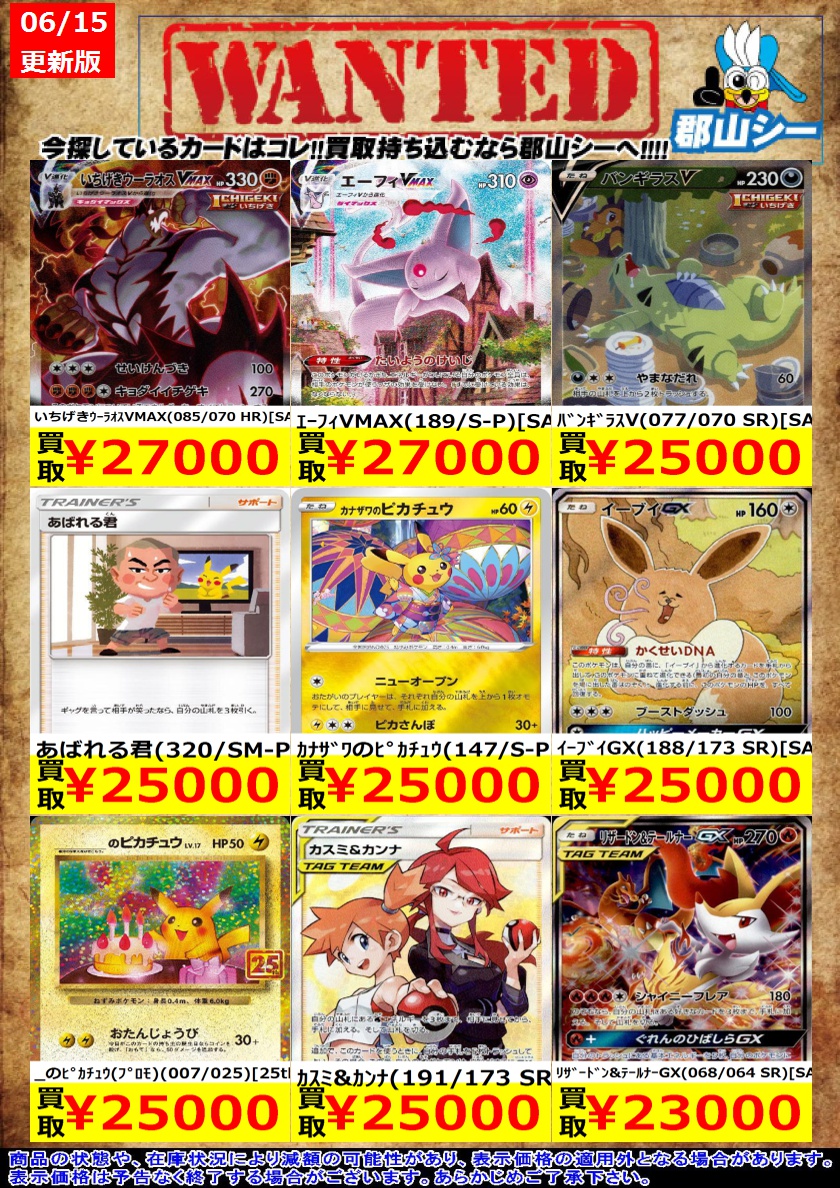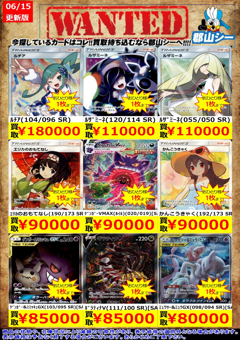 シーガル郡山店ポケカ数量限定お買取り情報更新です!よろしくお願いいたします! ※商品の状態や在庫状況により減額の可能性があり、表示価格の適用外となる場合がございます。 こくばバドレックスVMAX(086/070 HR)[SA] ¥45,000 ブラッキーGX(125/SM-P) ¥60,000 ルチア(104/096 SR) ¥180,000