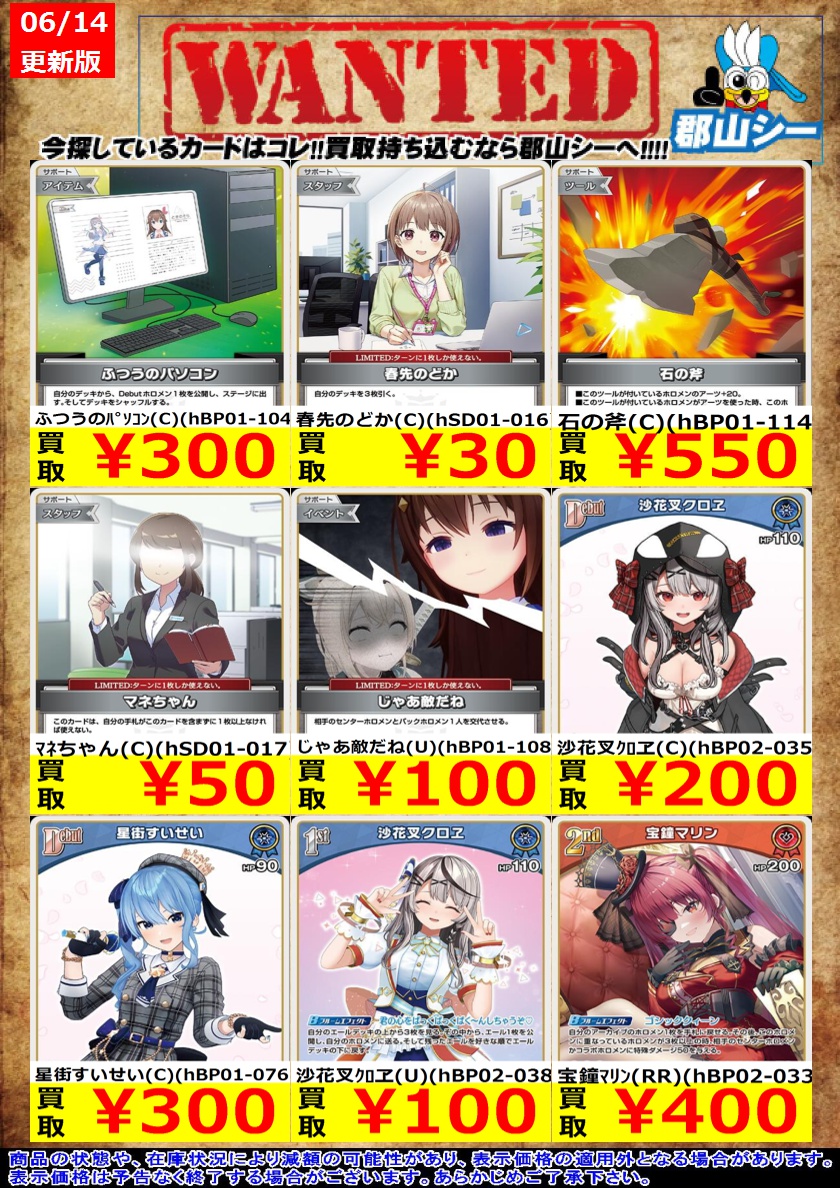 シーガル郡山店ホロライブOCGお買取り情報!! ※商品の状態や在庫状況により減額の可能性があり、表示価格の適用外となる場合がございます。 春先のどか(C)(hSD01-016) ¥30 宝鐘マリン(R)(hBP02-032) ¥30 マネちゃん(C)(hSD01-017) ¥50 #ホロライブOCG #ホロカ #シーガル郡山