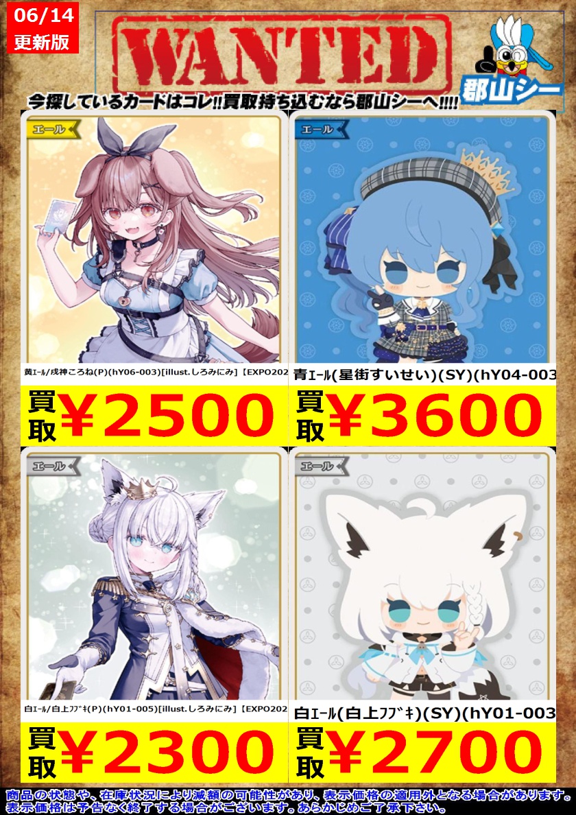 シーガル郡山店ホロライブOCGお買取り情報!! ※商品の状態や在庫状況により減額の可能性があり、表示価格の適用外となる場合がございます。 緑エール(風真いろは)(SY)(hY02-003) ¥1,800 緑エール(大神ミオ)(SY)(hY02-002) ¥1,300 白エール(白上フブキ)(SY)(hY01-003) ¥2,700