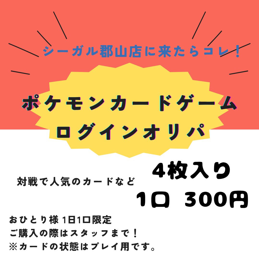 シーガル郡山店です! 大好評 レジにて販売中の ポケモンカード ログインオリパ 1口4枚入 300円 おひとり様1日1口までの購入制限 雨や雪など悪天候の日は 通常の“2倍”おひとり様2口まで! ご購入いただけます!! ご来店お待ちしております😊☂️