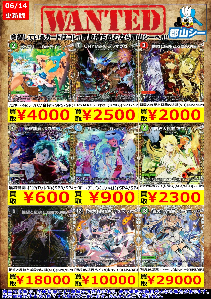 シーガル郡山店デュエマお買取り情報!! ※商品の状態や在庫状況により減額の可能性があり、表示価格の適用外となる場合がございます。 カンゴク入道(SP1/SP6) ¥3,000 卍 新世壊 卍(ホイル)(SP3/SP4) ¥1,800 獰猛なる大地(R/ホイル)(SP2/SP4) ¥400