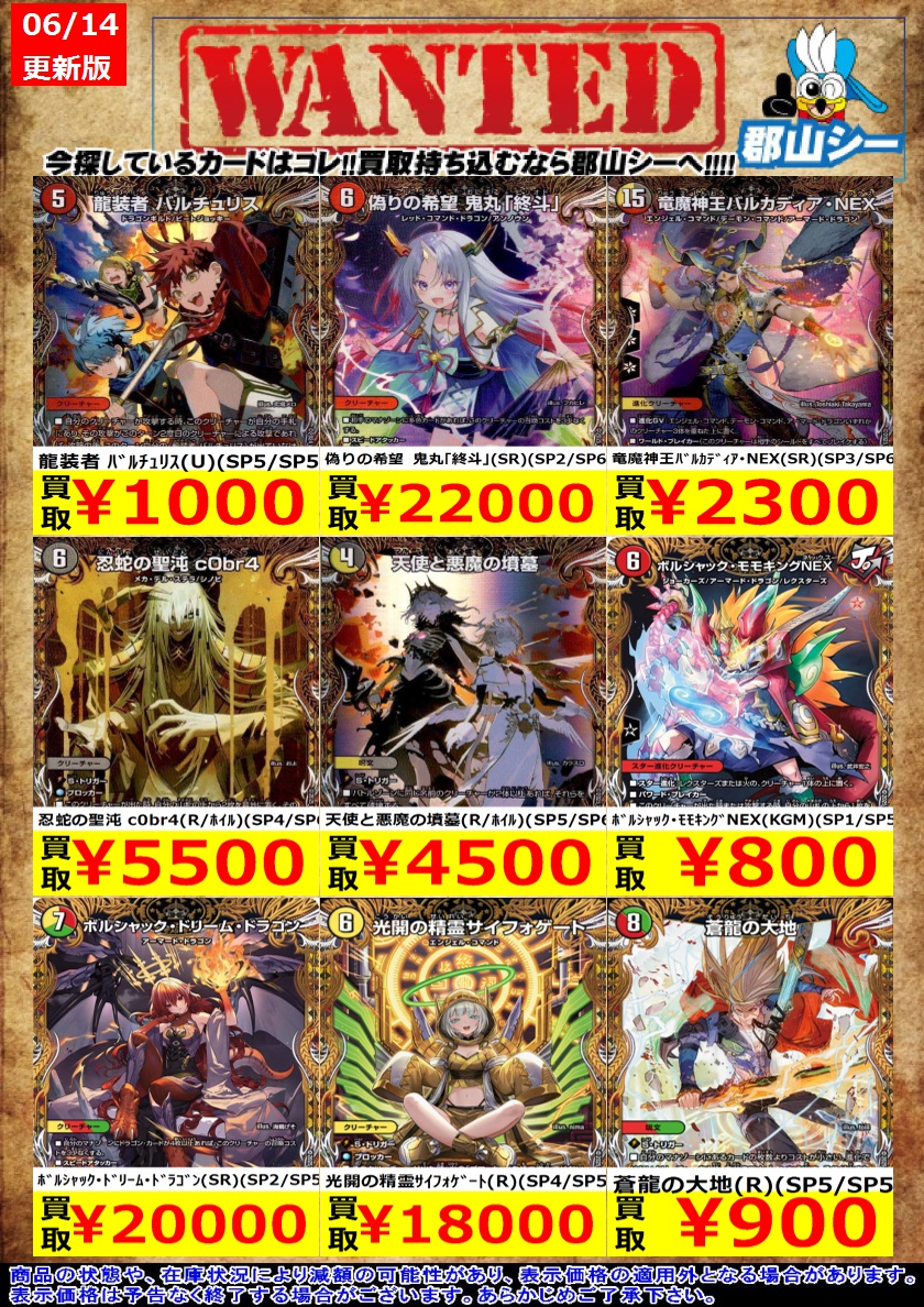 シーガル郡山店デュエマお買取り情報!! ※商品の状態や在庫状況により減額の可能性があり、表示価格の適用外となる場合がございます。 サイバー・ブレイン(U/ホイル)(SP4/SP4) ¥900 「無月」の頂 $スザーク$(SR)(SP4/SP8) ¥10,000 #デュエルマスターズ #デュエマ #シーガル郡山