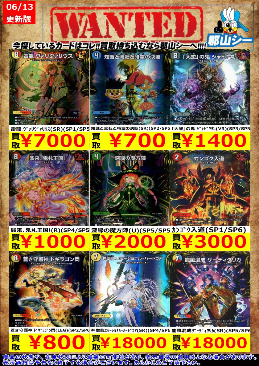 シーガル郡山店デュエマお買取り情報!! ※商品の状態や在庫状況により減額の可能性があり、表示価格の適用外となる場合がございます。 カンゴク入道(SP1/SP6) ¥3,000 卍 新世壊 卍(ホイル)(SP3/SP4) ¥1,800 獰猛なる大地(R/ホイル)(SP2/SP4) ¥400 #デュエルマスターズ #デュエマ #シーガル郡山