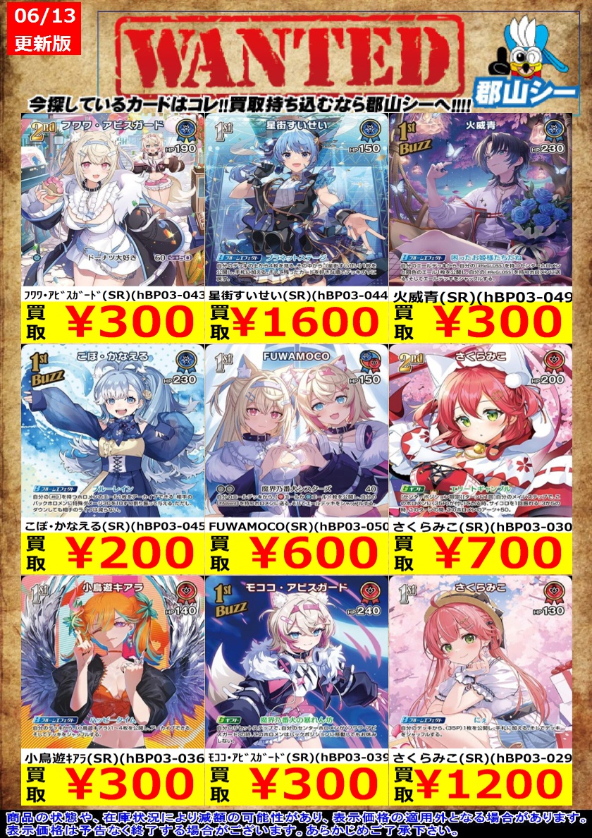 シーガル郡山店ホロライブOCGお買取り情報!! ※商品の状態や在庫状況により減額の可能性があり、表示価格の適用外となる場合がございます。 角巻わため(SR)(hBP03-072) ¥350 魔法少女みこ(SR)(hBP02-069) ¥100 魔法少女かなた(SR)(hBP02-070) ¥100 #ホロライブOCG #ホロカ #シーガル郡山