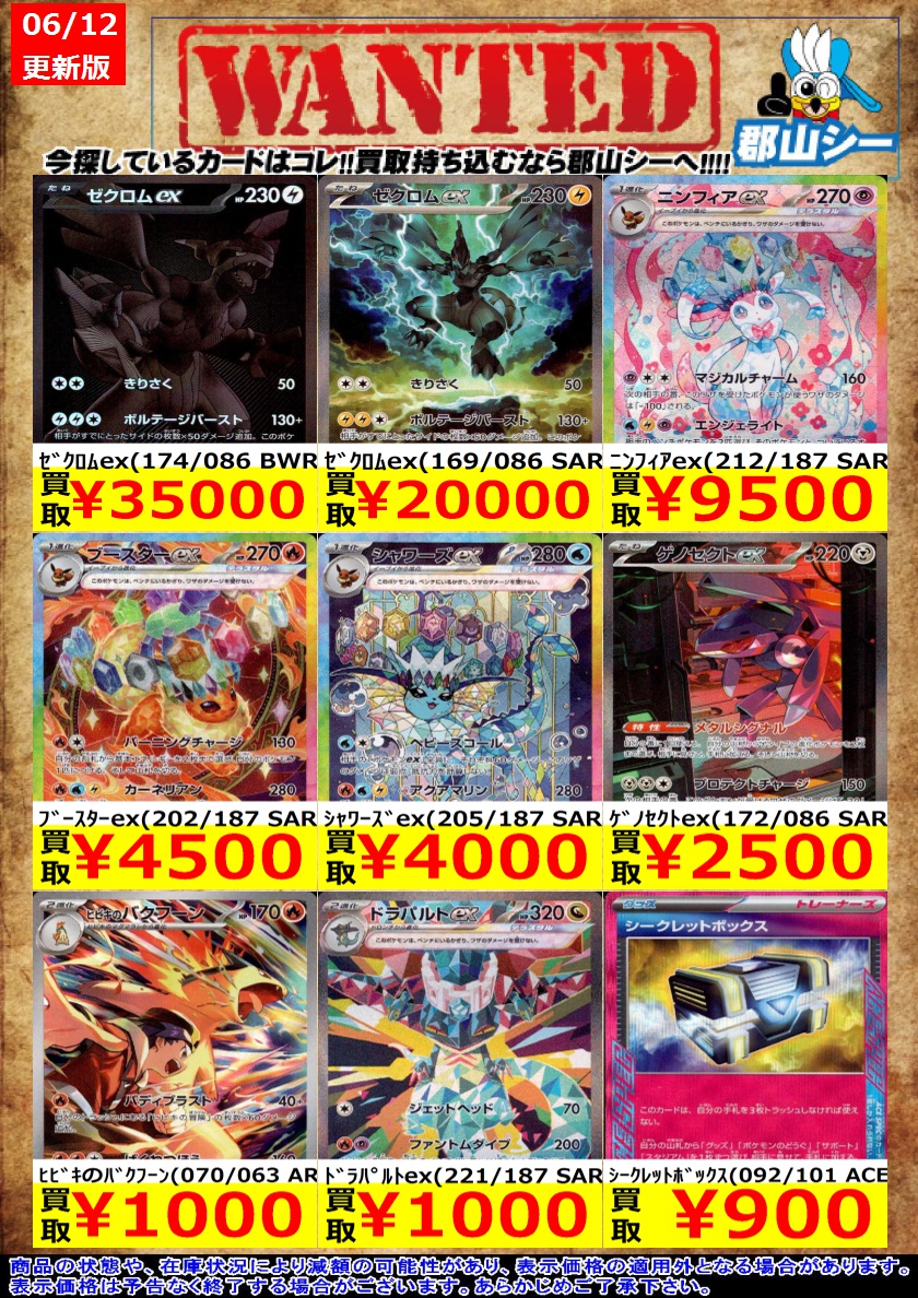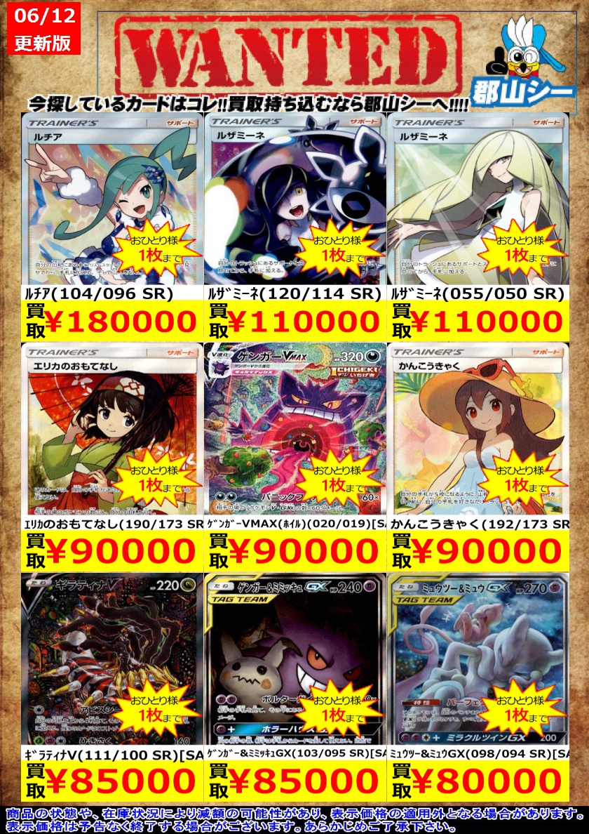 シーガル郡山店ポケカ数量限定お買取り情報更新です!よろしくお願いいたします! ※商品の状態や在庫状況により減額の可能性があり、表示価格の適用外となる場合がございます。 こくばバドレックスVMAX(086/070 HR)[SA] ¥45,000 ブラッキーGX(125/SM-P) ¥60,000 ルチア(104/096 SR) ¥180,000