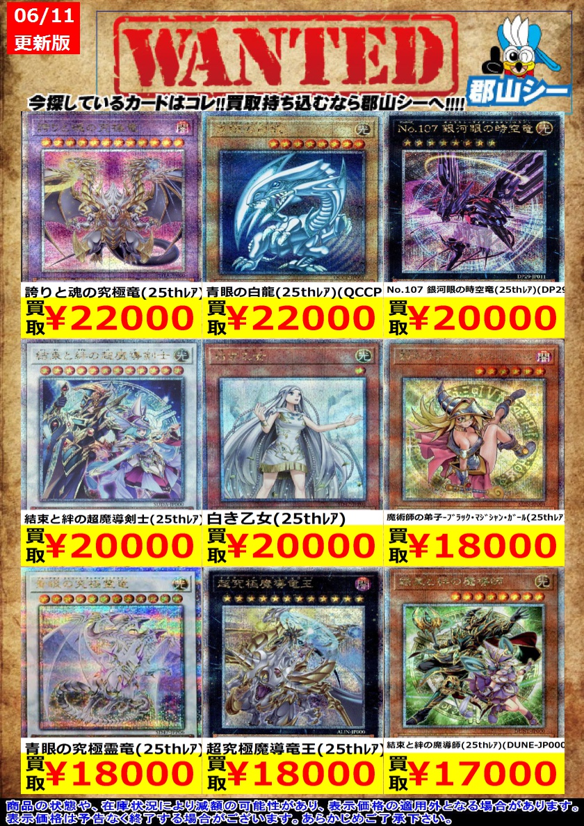 シーガル郡山店遊戯王お買取り情報 ※商品の状態や在庫状況により減額の可能性があり、表示価格の適用外となる場合がございます。 清冽の水霊使いエリア(25thレア) ¥4,000 ハーピィの羽根帚(25thレア/イラスト違い)(QCCP) ¥6,000 結束と絆の魔導師(25thレア)(LEDE) ¥8,000