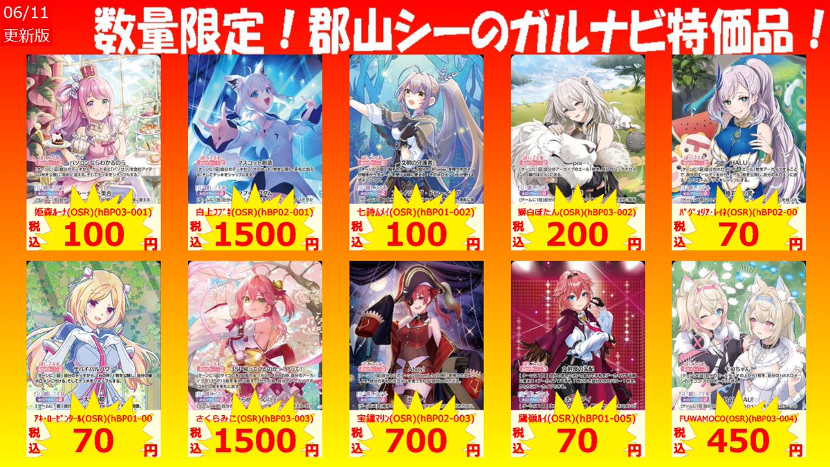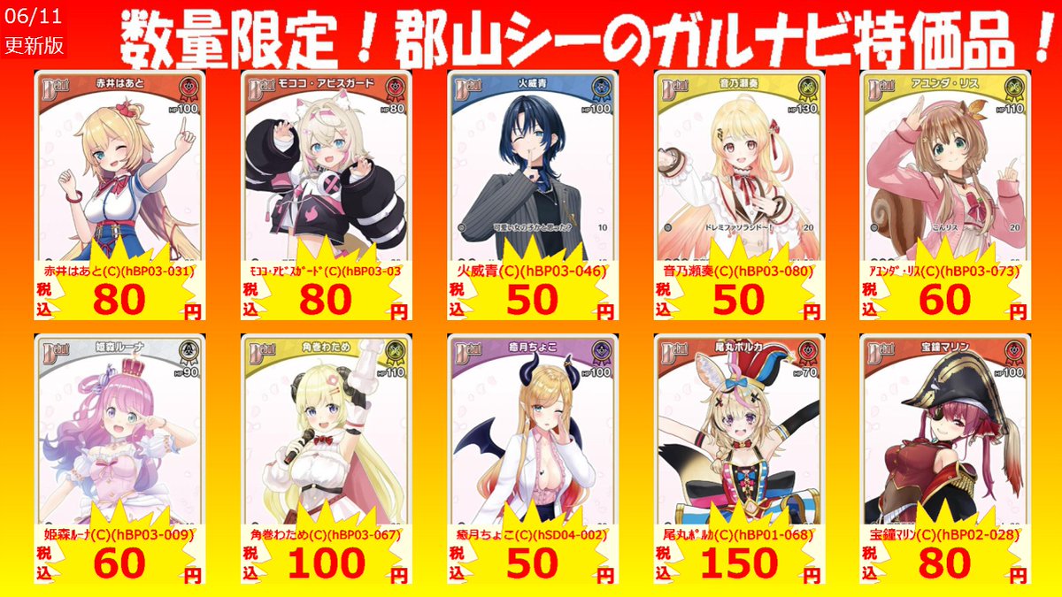 数量限定郡山シー限定ガルナビ特価品! 癒月ちょこ(C)(hSD04-002) ¥50 宝鐘マリン(C)(hBP02-028) ¥80 みっころね24(U)(hBP02-084) ¥550 #ホロカ #特価品 #シーガル郡山
