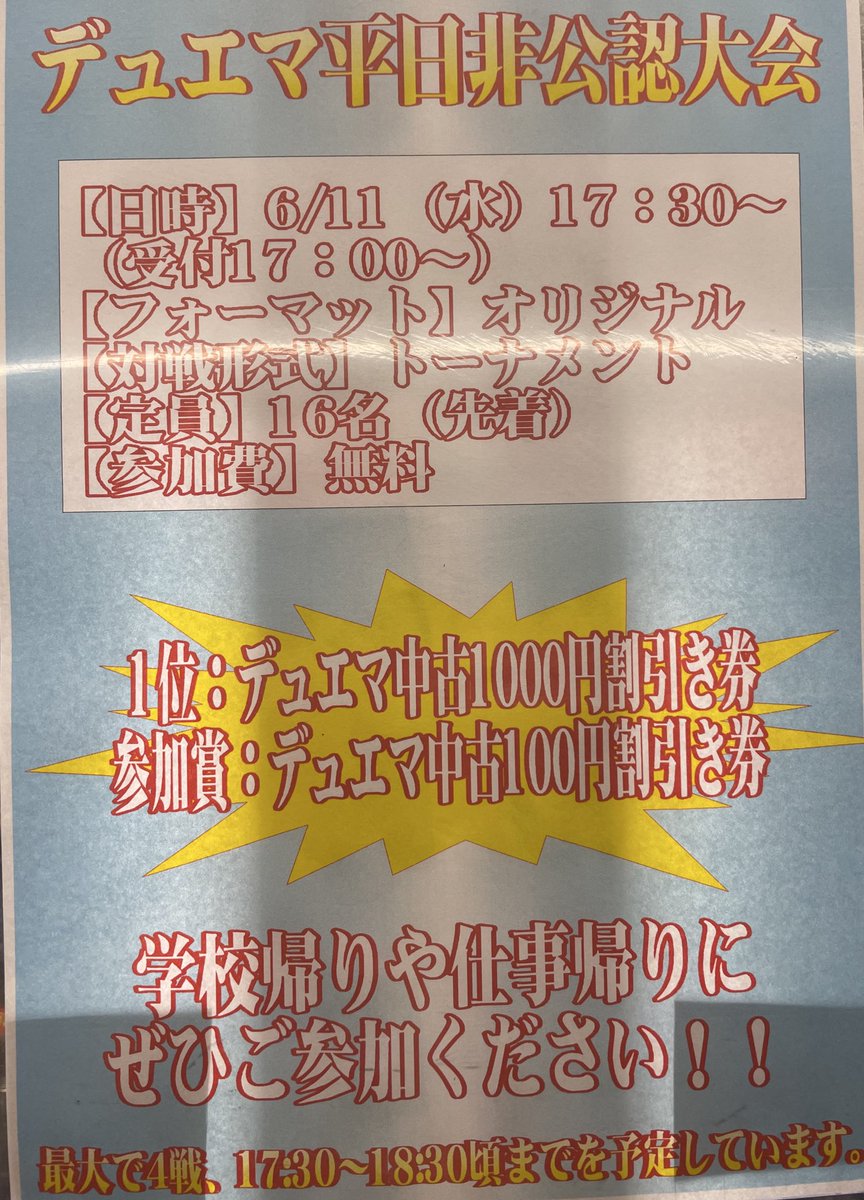 6月11日にデュエマ平日非公認大会を行います❗️ 参加費無料、優勝賞品はデュエマ中古1000円割引券です✨ ご参加お待ちしております🙇♂️