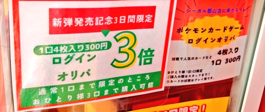 シーガル郡山店です! 本日 ポケモンカード 非公認大会開催します。(事前エントリー受付締切) レジにて好評販売中の ポケカ ログインオリパ は 新弾発売記念 おひとり様 3口までご購入いただけます😊 ショーケースにも新弾カード展開中!! ご来店お待ちしております✨