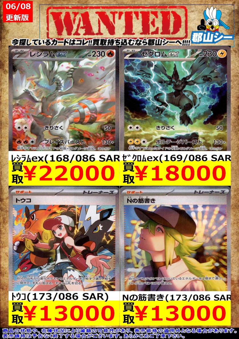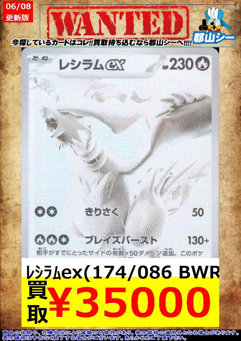 シーガル郡山店ポケカ数量限定お買取り情報更新です!よろしくお願いいたします! ※商品の状態や在庫状況により減額の可能性があり、表示価格の適用外となる場合がございます。 ゼクロムex(174/086 BWR) ¥33,000 レシラムex(174/086 BWR) ¥35,000