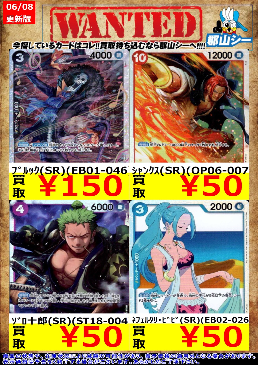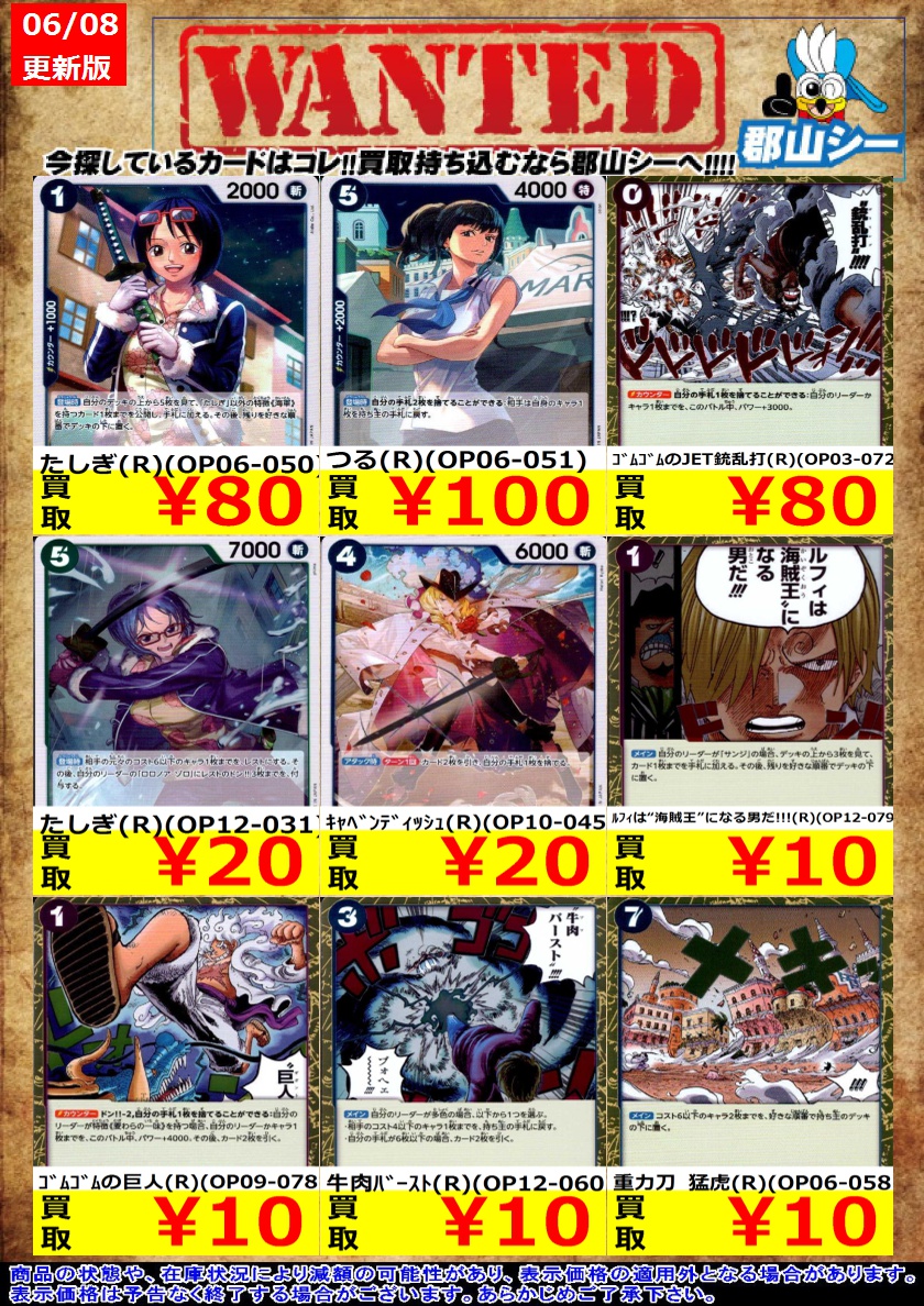 シーガル郡山店ワンピースお買取り情報!※商品の状態や在庫状況により減額の可能性があり、表示価格の適用外になる場合がございます。予めご了承ください。 光月日和(R)(OP12-028) ¥10 ルフィは海賊王になる男だ!!!(R)(OP12-039) ¥10 #高価買取 #ワンピース #シーガル郡山