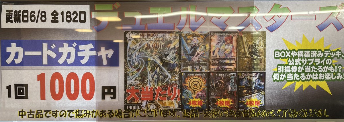 おはようございます☀️ デュエマ1000円自販機を補充いたしました❗️ 今回の大当たりは「修羅」の頂VANベートーベンのCS優勝プロモです✨ よろしくお願いいたします🙇♂️