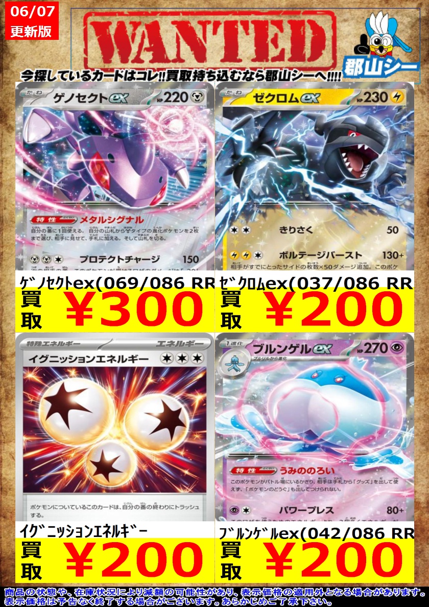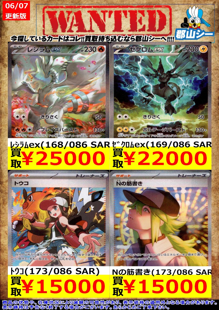 シーガル郡山店ポケカ数量限定お買取り情報更新です!よろしくお願いいたします! ※商品の状態や在庫状況により減額の可能性があり、表示価格の適用外となる場合がございます。 ドリュウズex(171/086 SAR) ¥1,000 バッフロンex(172/086 SAR) ¥1,200 Nの筋書き(165/086 SR) ¥1,500
