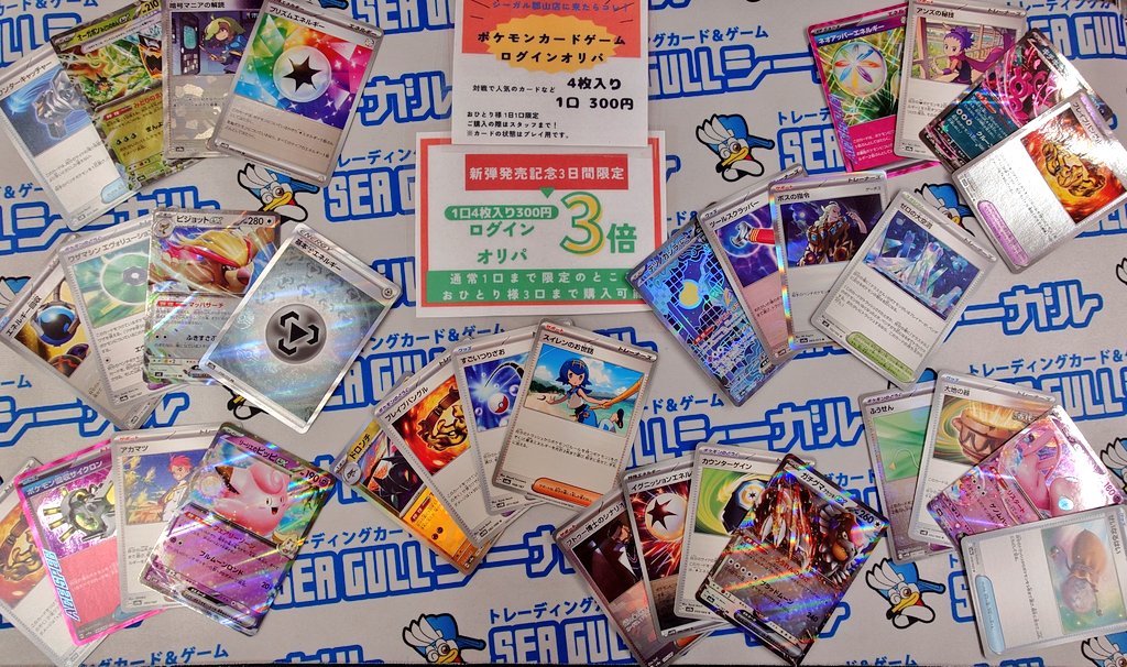 おはようございます☀ シーガル郡山店です! ポケモンカード〝ログインオリパ〟 対戦で人気のカードなどが入って 1口4枚入り 300円! 新弾発売記念!明日までおひとり様 3口ご購入頂けます! お求めの際はレジでお声かけください🙏 本日こんな一例追加しました! ご来店お待ちしております✨