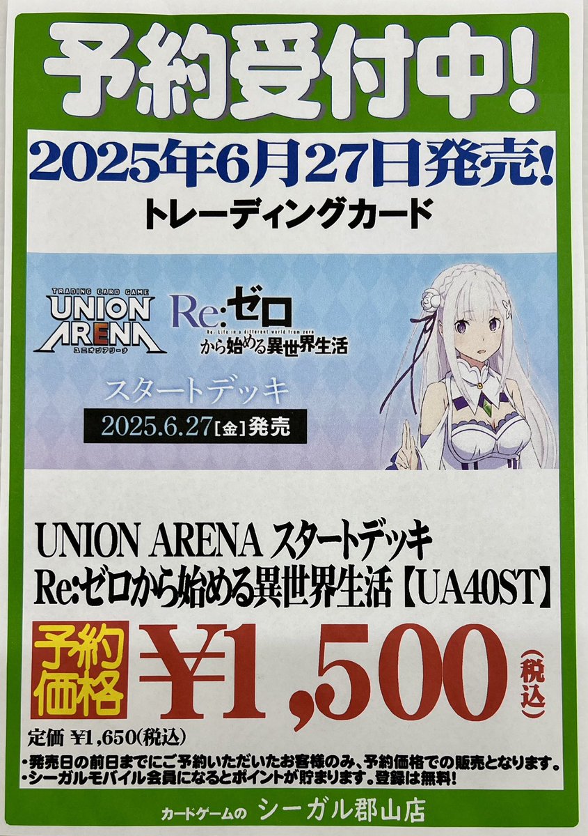 【ご予約受付中】 6/27 発売 #ユニオンアリーナ スタートデッキ 『Re:ゼロから始める異世界生活』 【UA40ST】 ただいま予約受付中です❗️ ご予約お待ちしております😊 #シーガル郡山店予約