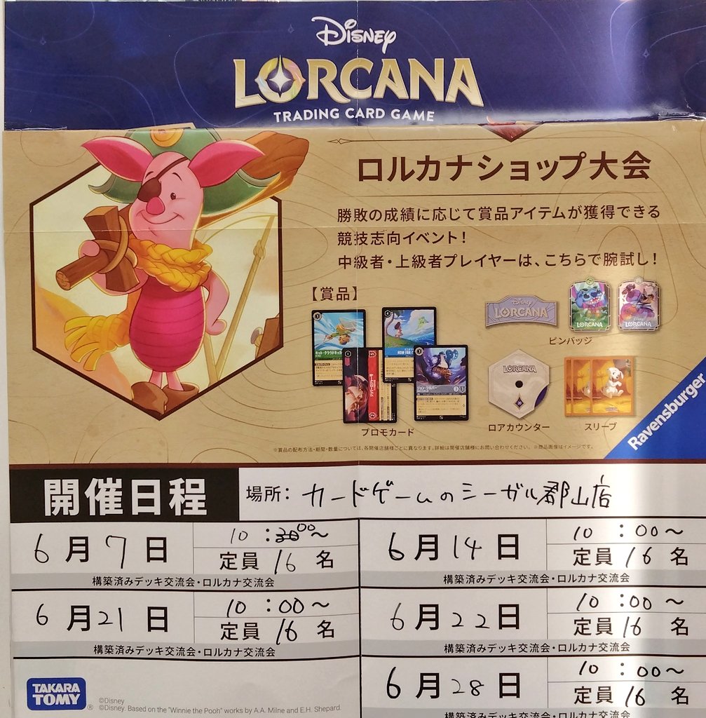 シーガル郡山店です! ロルカナショップ大会の日程表となります〜! 6月29日にはセットチャンピオンシップもありますのでショップ大会で練習してみてはいかがでしょうか? 来てください😢
