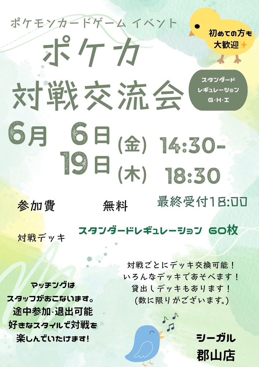 シーガル郡山店です! 今週 6日(金)14:30-18:30 (18:00受付終了) ポケカ対戦交流会を開催します! 新弾カードで対戦したい方! ポケモンカード で遊びたい方! 途中参加・途中退出OK 対戦ごとのデッキ交換OK 貸出デッキあり!手ぶら参加もOK! 皆さまのお越しをお待ちしております😊