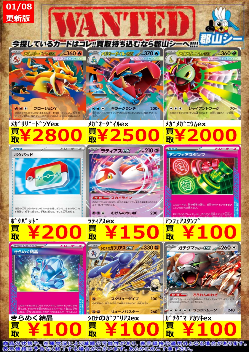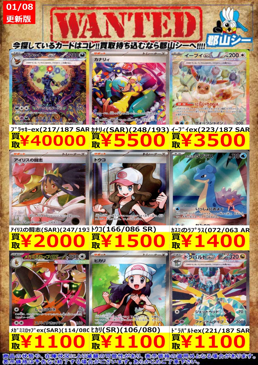 こちらはすべてノンキラでの募集となります!! シーガル郡山店ポケカ数量限定お買取り情報更新です!よろしくお願いいたします! ※商品の状態や在庫状況により減額の可能性があり、表示価格の適用外となる場合がございます。 テラパゴスex ¥50 エーフィex ¥100 ボスの指令(カラスバ) ¥30