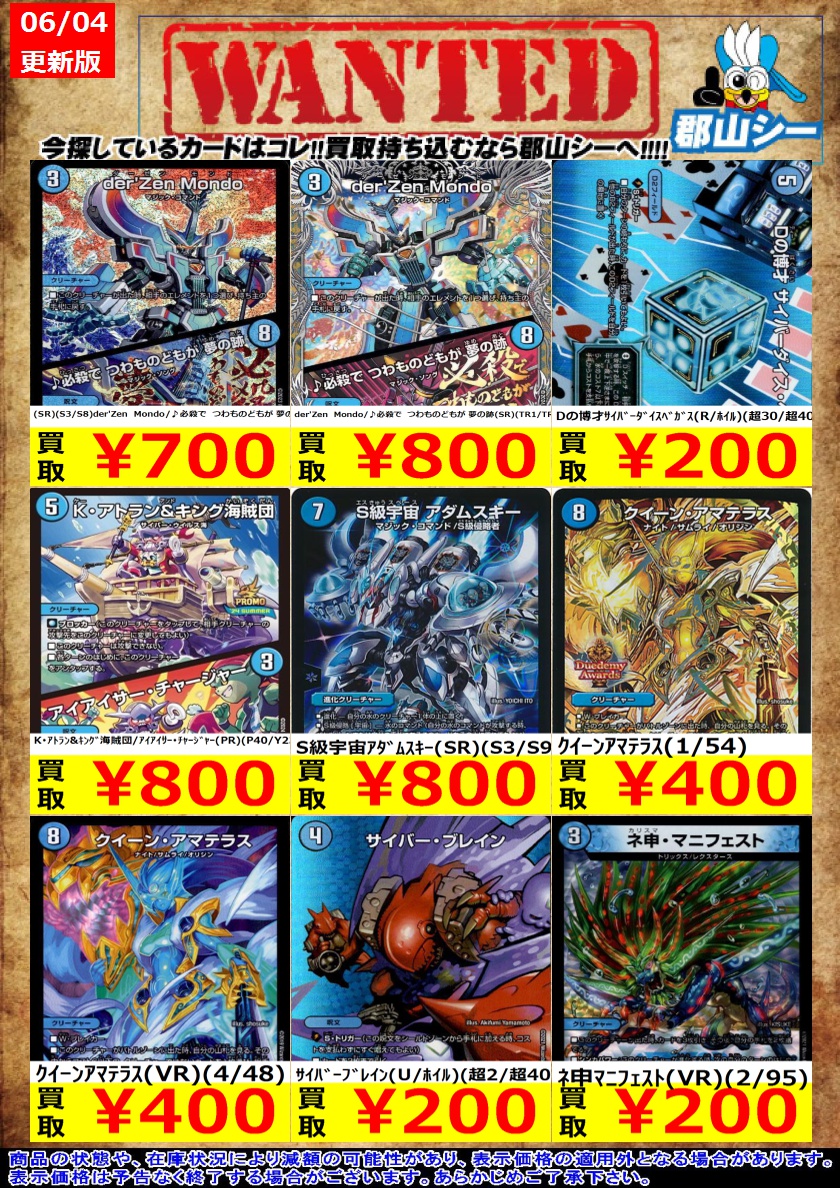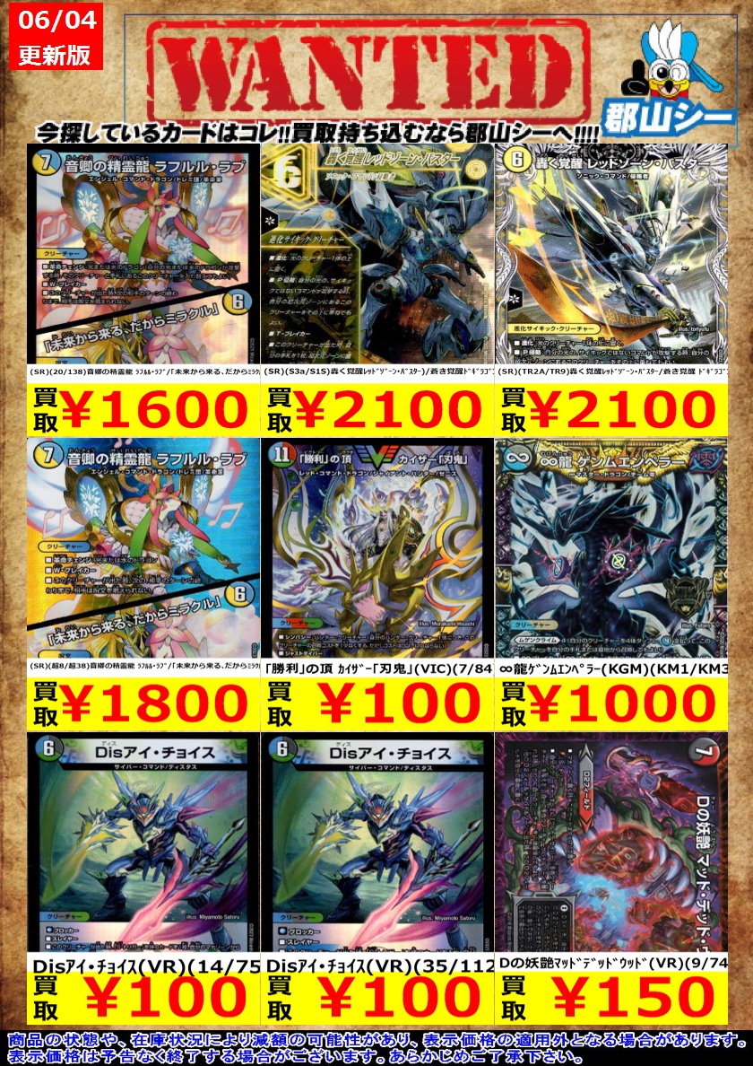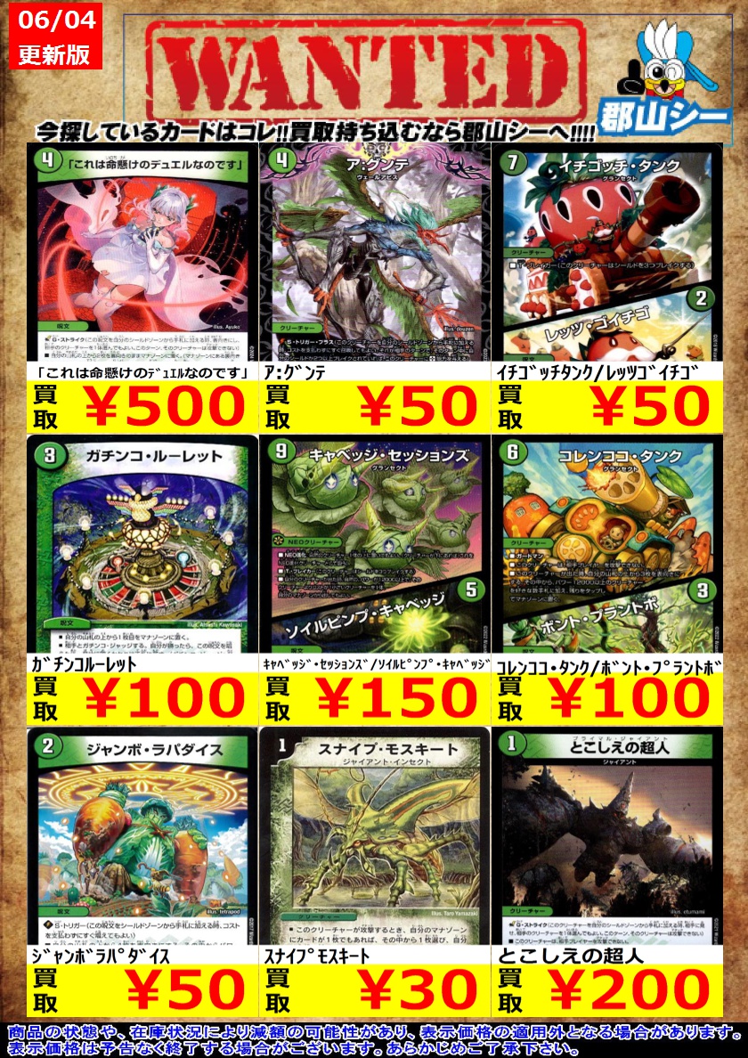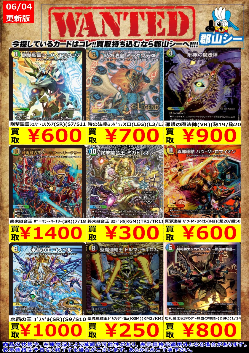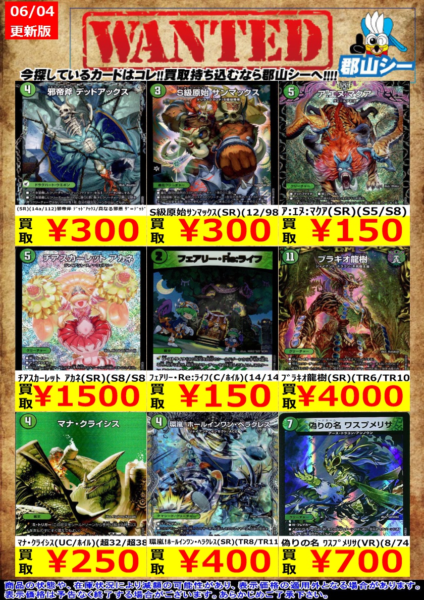 シーガル郡山店デュエマお買取り情報!! ※商品の状態や在庫状況により減額の可能性があり、表示価格の適用外となる場合がございます。 ウィリデ・ゴル・ゲルス(SR)(S2/S10) ¥200 魔誕の騎士ザガーン(SR)(S1/S11) ¥250 神聖龍 エモーショナル・ハードコア(SR)(15/60) ¥350