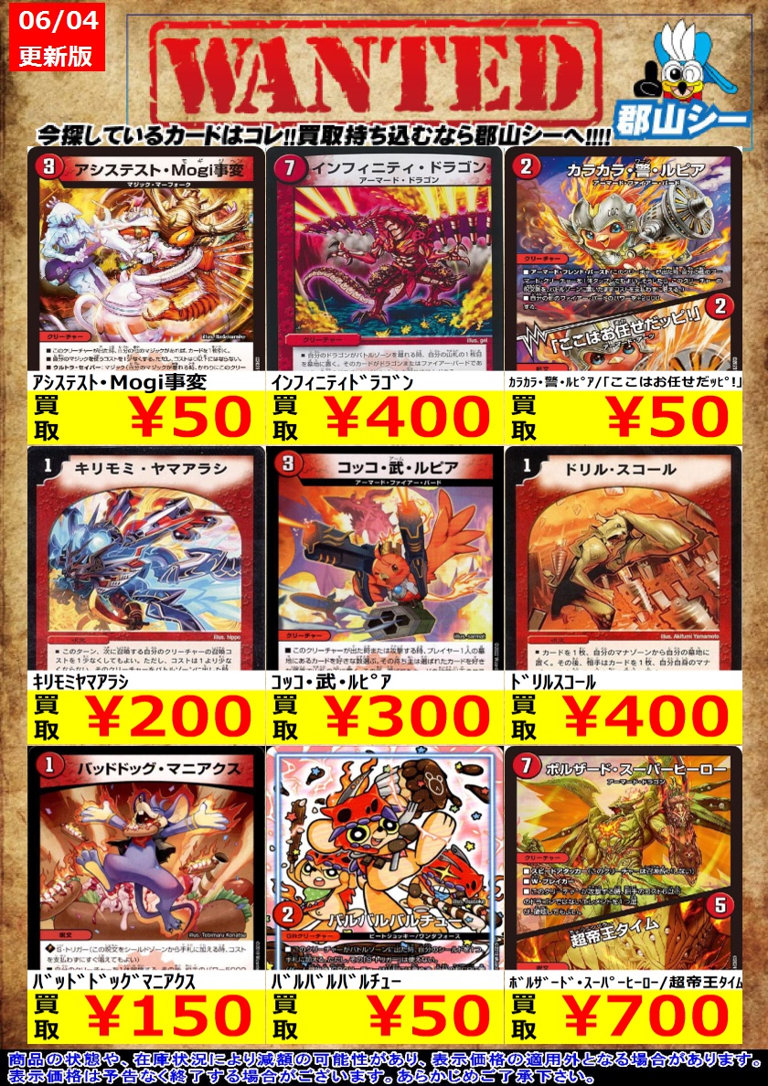 シーガル郡山店デュエマノーマルお買取り情報!! ※商品の状態や在庫状況により減額の可能性があり、表示価格の適用外となる場合がございます。 竜装ザンゲキマッハアーマー ¥30 コッコ・武・ルピア ¥300 ボルシャックドラゴン/決闘者チャージャー ¥30