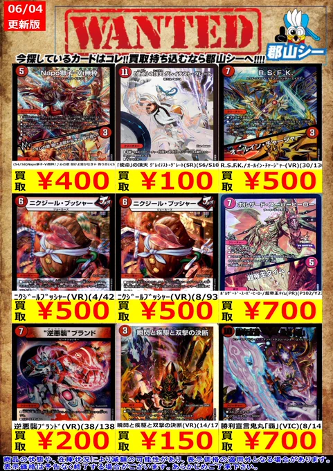 シーガル郡山店デュエマお買取り情報!! ※商品の状態や在庫状況により減額の可能性があり、表示価格の適用外となる場合がございます。 ニクジールブッシャー(VR)(8/93) ¥500 R.S.F.K./オールイン・チャージャー(VR)(30/130) ¥500