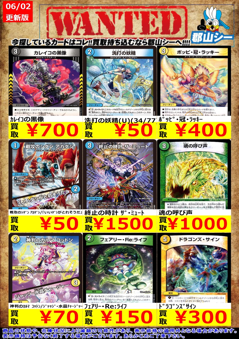 シーガル郡山店デュエマノーマルお買取り情報!! ※商品の状態や在庫状況により減額の可能性があり、表示価格の適用外となる場合がございます。 洗打の妖精(U)(34/77) ¥50 ポッピ・冠・ラッキー ¥400 カレイコの黒像 ¥700