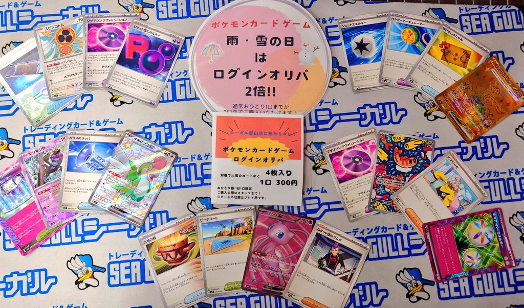 シーガル郡山店です! ポケモンカードゲーム 本日イベントのお知らせ⋆͛📢⋆ ジムバトル 午前・午後予定しております😊 ポケモンカード ログインオリパ 本日雨の日2倍デー( ͜☔️ ・ω・) ͜☔️おひとりさま二口まで購入OKです! 画像の5口 追加しました✨ みなさまのご来店お待ちしております✨