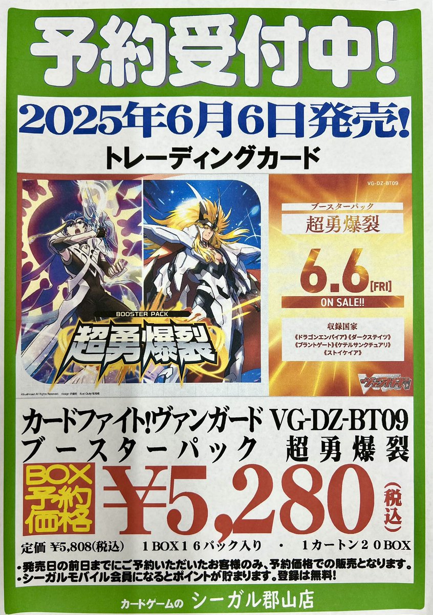【ご予約受付中】 6/6 発売 #ヴァンガード ブースターパック『超勇爆裂』 ただいま予約受付中です❗️ ご予約お待ちしております😊 #シーガル郡山店予約