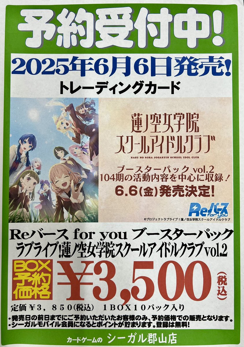 【ご予約受付中】 6/6 発売 #Reバース ブースターパック 「ラブライブ!蓮ノ空女学院スクールアイドルクラブ vol.2」 ただいま予約受付中です❗️ ご予約お待ちしております😊 #シーガル郡山店予約