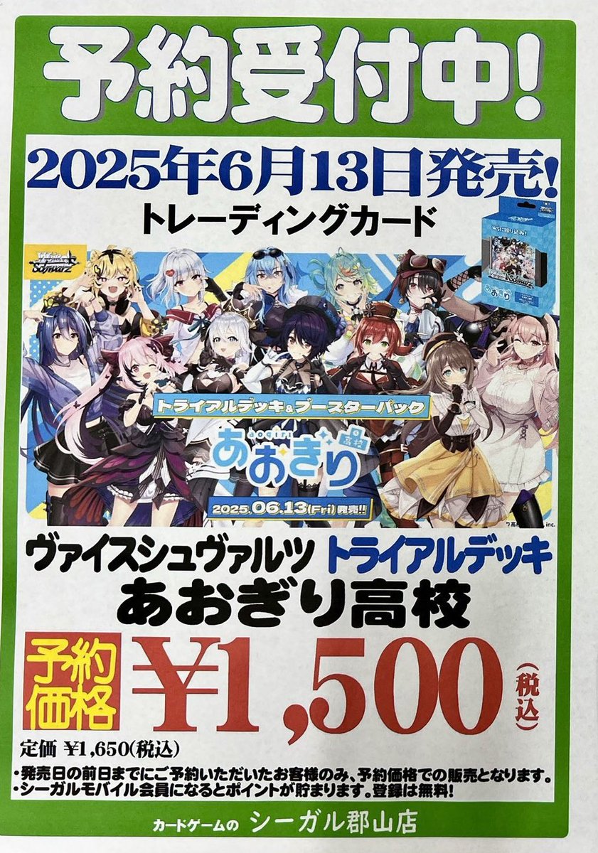 【ご予約受付中】 6/13 発売 #ヴァイスシュヴァルツ 『あおぎり高校』 ✅トライアルデッキ ただいま予約受付中です❗️ ※ブースターパックは受付終了しました🙇♂️ ご予約お待ちしております😊 #シーガル郡山店予約