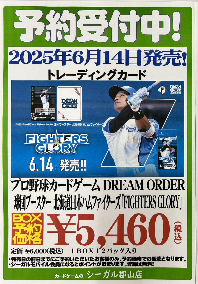 【ご予約受付中】 6/14 発売 ⚾️プロ野球カードゲーム⚾️ ドリームオーダー ✅球団ブースター 北海道日本ハムファイターズ「FIGHTERS GLORY」 ただいまご予約受付中です❗️ ご予約お待ちしております😊 #シーガル郡山店予約