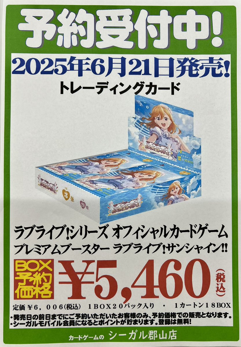 【ご予約受付中】 6/21 発売 ラブライブ!シリーズ オフィシャルカードゲーム プレミアムブースター 「ラブライブ!サンシャイン!!」 ただいま予約受付中です❗️ ご予約お待ちしております😊 #シーガル郡山店予約