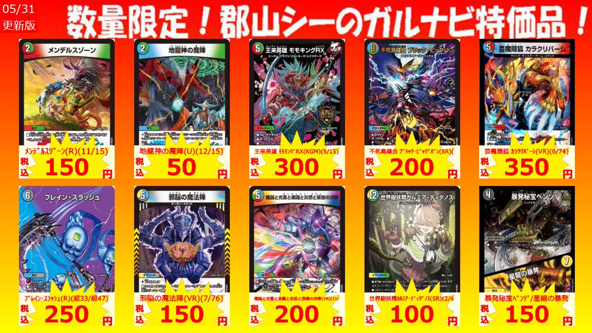 数量限定!郡山シー限定ガルナビ特価品 激烈元気モーニンジョー ¥100 暴発秘宝ベンゾ/星龍の暴発 ¥150 混沌の獅子デスライガー/カオス・チャージャー ¥200 #デュエマ #シーガル郡山 #アツアツ特価