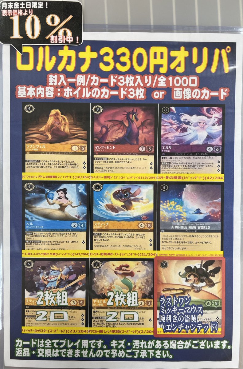 月末金土日限定割引‼️ 《ロルカナ330円オリパ》 5/30~6/1まで10%割引中です✨️ 残り25口! この機会に是非ぜひお試しください(*´ω`*)