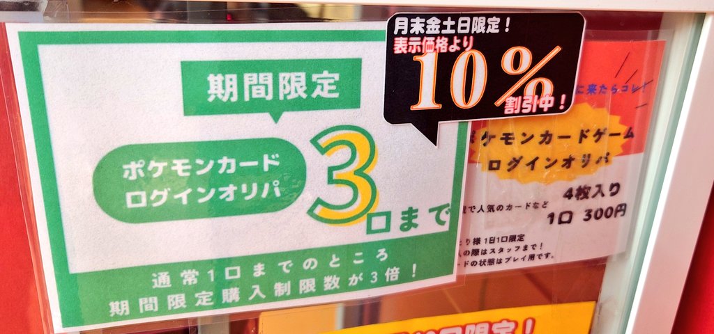 シーガル郡山店です! 月末金土日割引 ポケモンカードゲーム 《ログインオリパ》 5/30~6/1まで10%割引中です! 対戦で人気のカード4枚入り 今だけ 1口 270円! さらに 1日3口までご購入いただけます! お求めの際はレジスタッフまでお願いします🙏 本日こんな一例追加しました✨ お待ちしてます😊