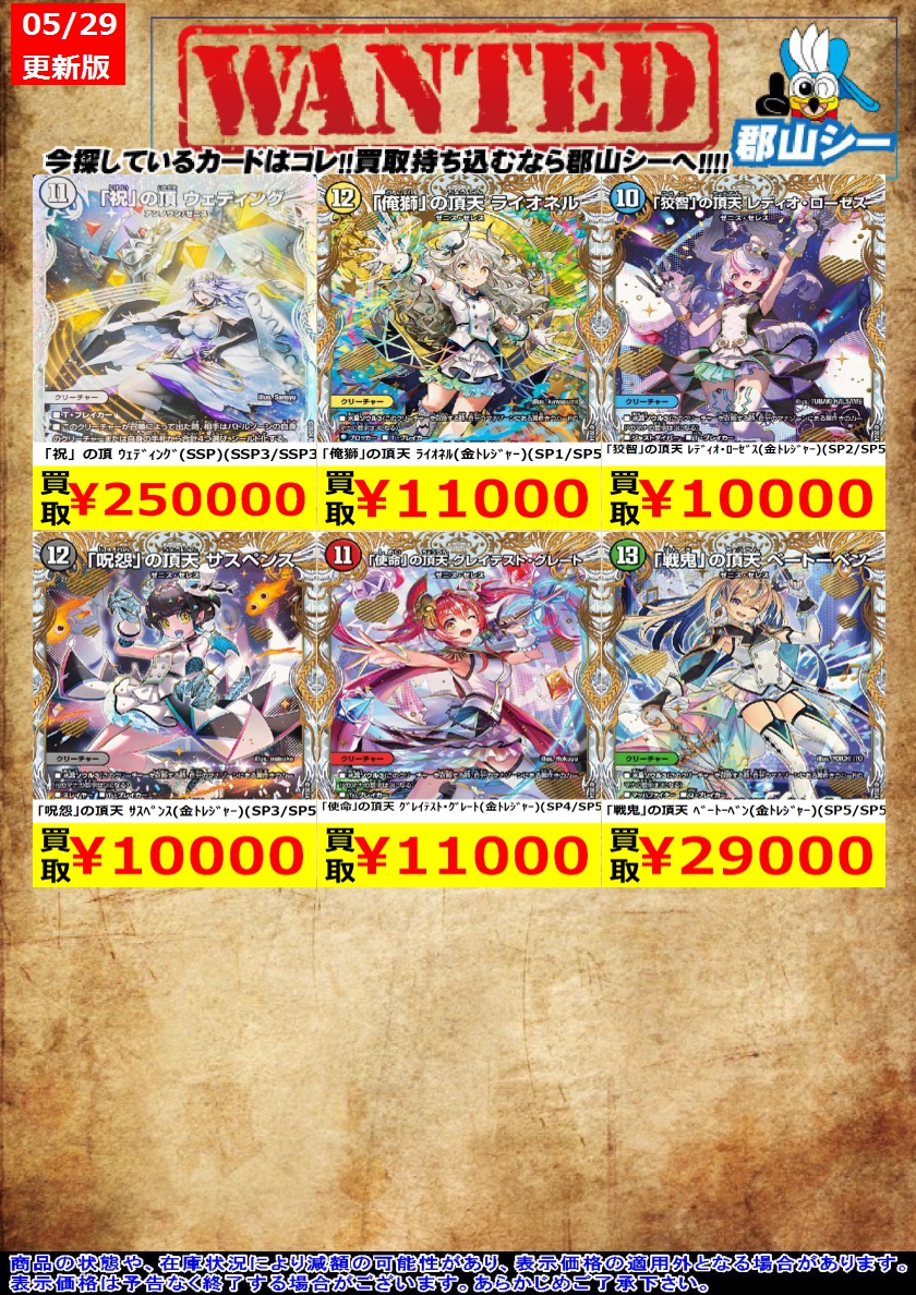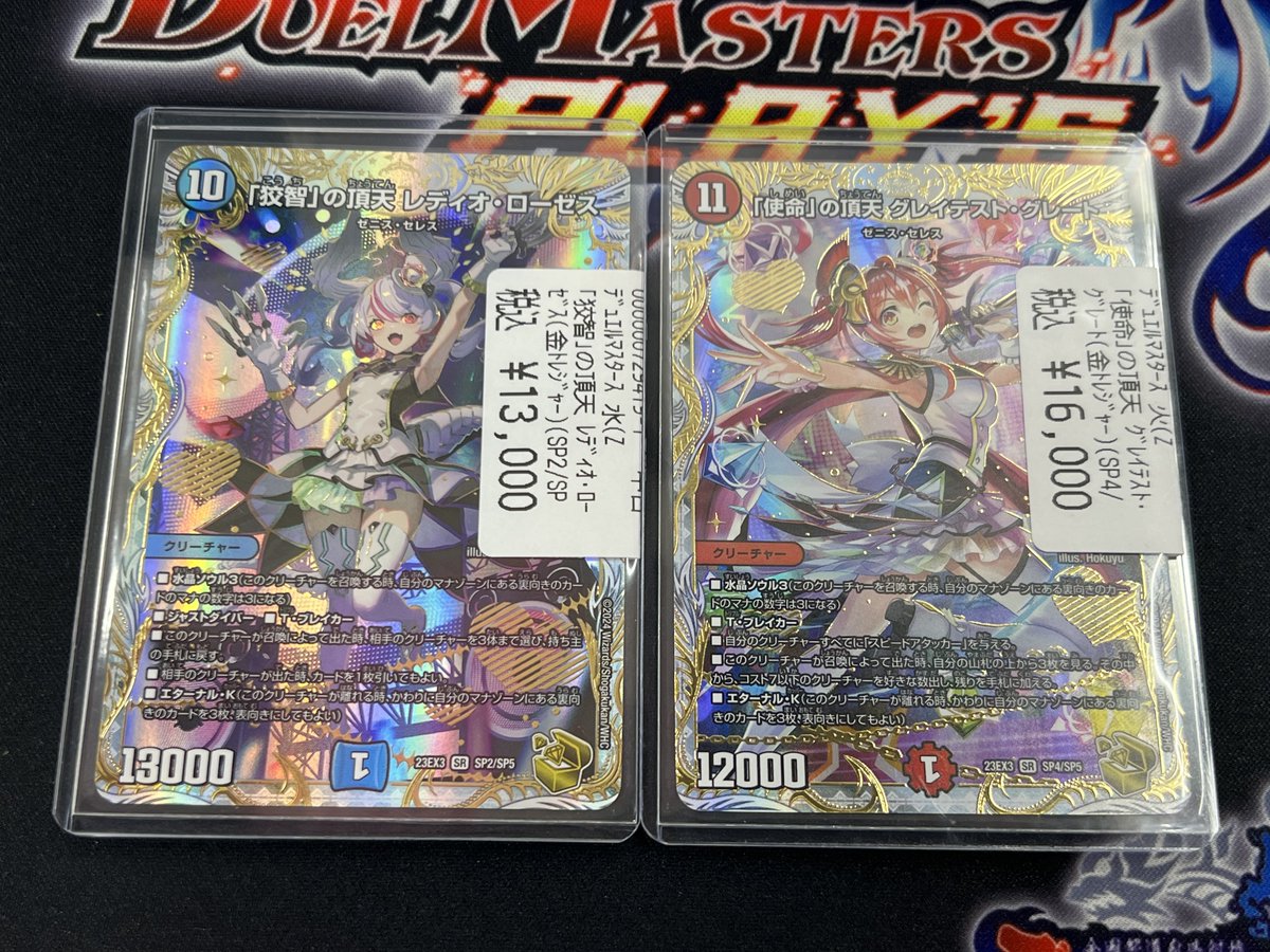シーガル郡山店デュエマお買取り情報!! ※商品の状態や在庫状況により減額の可能性があり、表示価格の適用外となる場合がございます。 「呪怨」の頂天 サスペンス(金トレジャー)(SP3/SP5) ¥10,000 「使命」の頂天 グレイテスト・グレート(金トレジャー)(SP4/SP5) ¥11,000