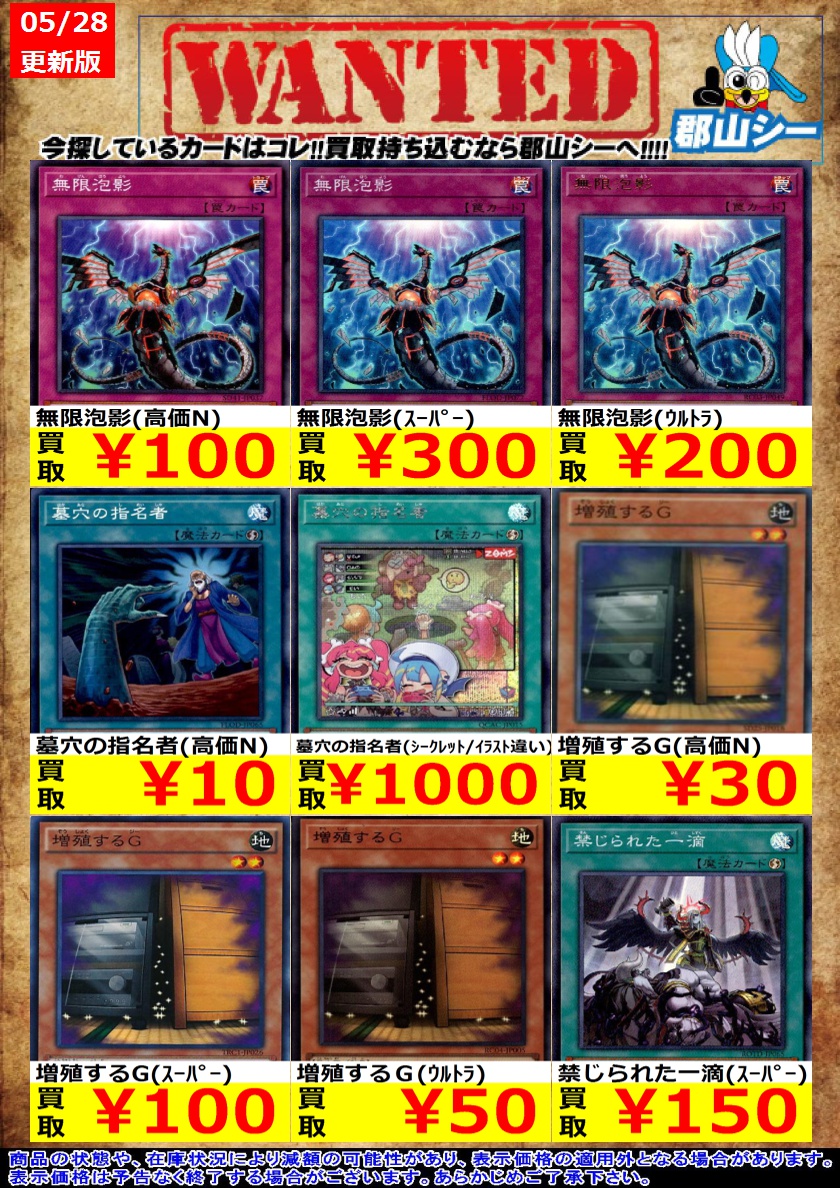 シーガル郡山店遊戯王お買取り情報 ※商品の状態や在庫状況により減額の可能性があり、表示価格の適用外となる場合がございます。 増殖するG(高価N) ¥30 灰流うらら(高価N) ¥30 灰流うらら(ウルトラ) ¥50 #遊戯王 #シーガル #郡山店