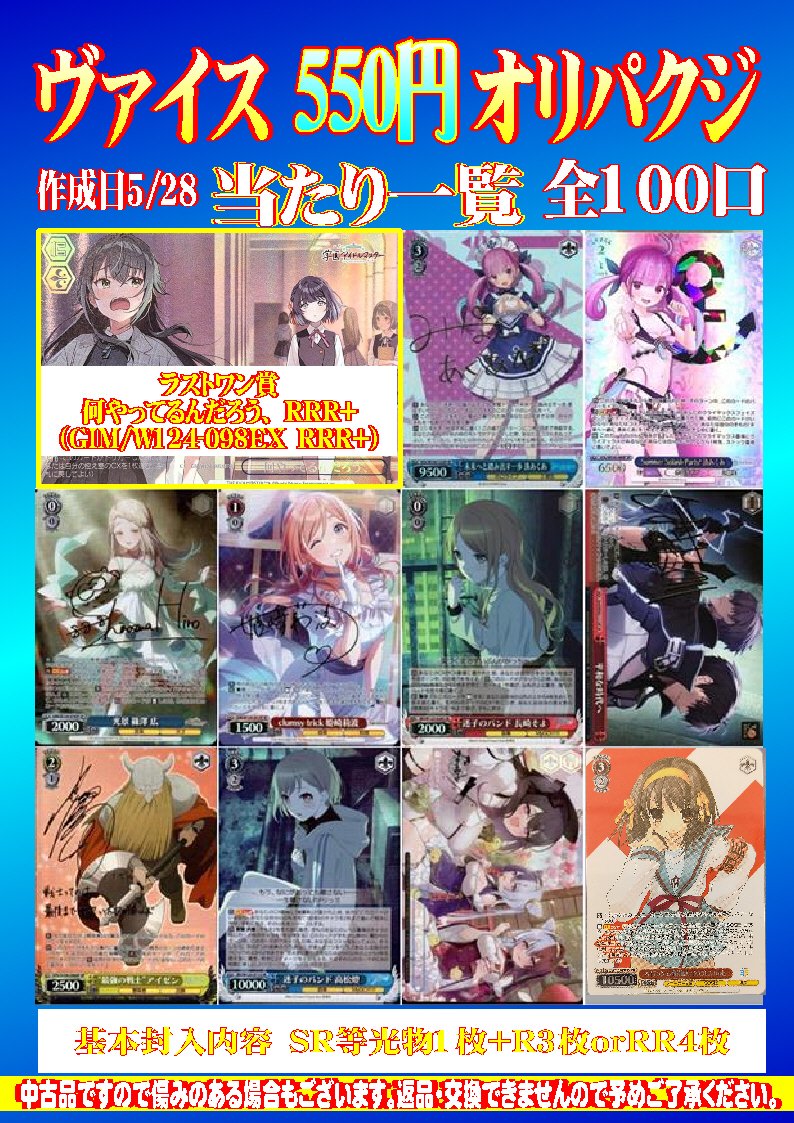 シーガル郡山店です! ヴァイスシュヴァルツ 550円オリパクジ 作成しました✨ 全100口、ラストワン賞あり の商品となっております! よろしくお願いします‼️