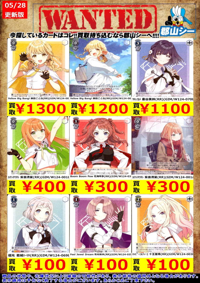 シーガル郡山店ヴァイスお買取り情報!※商品の状態や在庫状況により減額の可能性があり、表示価格の適用外になる場合がございます。予めご了承ください。 B小町アイ(RR)(OSK/S107-034) ¥250 B小町ルビー(RR)(OSK/S107-001) ¥400 #ヴァイスシュヴァルツ #買取 #シーガル郡山店