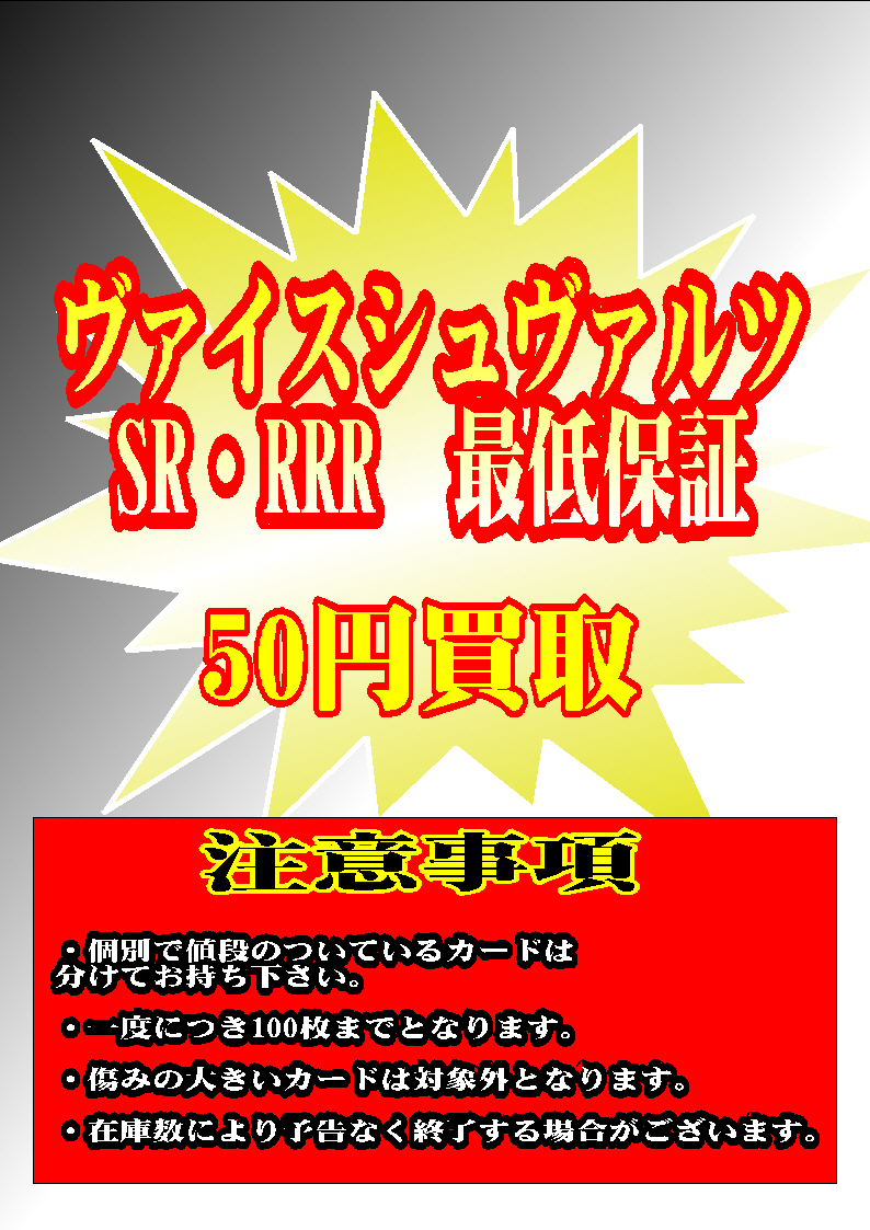 シーガル郡山店です! ヴァイスシュヴァルツ SR・RRR 最低保証50円 お買取いたします! お持ち込みの際は注意事項を確認の上お越しください。 よろしくお願いします!!!