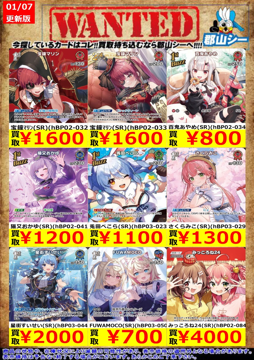 シーガル郡山店ホロライブOCGお買取り情報!! ※商品の状態や在庫状況により減額の可能性があり、表示価格の適用外となる場合がございます。 百鬼あやめ(OSR)(hBP06-004) ¥1,000 風真いろは(OSR)(hBP06-003) ¥1,100 ロボ子さん(OSR)(hBP06-007) ¥100