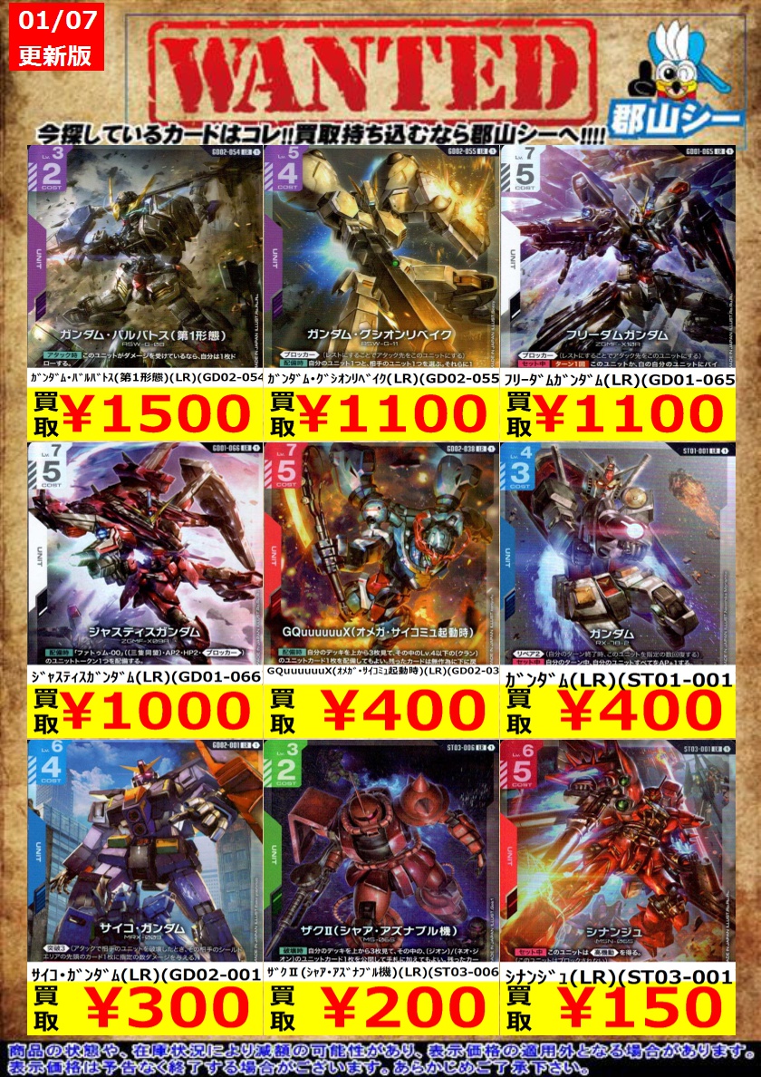 シーガル郡山店ガンダムCGお買取情報!! ガンダムデスサイズ(LR)(GD01-025) ¥100 サイコ・ガンダム(LR)(GD02-001) ¥300 ガンダム(LR)(ST01-001) ¥400