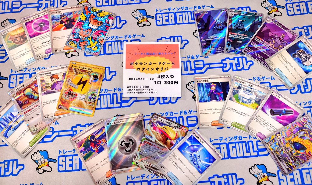 おはようございます☀ シーガル郡山店です! ポケモンカードゲーム 〝ログインオリパ〟 対戦で人気のカードなどが入って 1口4枚入り 300円! おひとり様1日1口限定! お求めの際はレジスタッフまでお声かけください🙏 本日こんな一例追加しました! ご来店お待ちしております✨