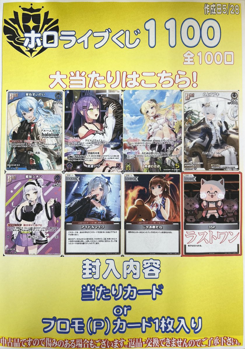 🌈ホロライブ1100円くじ🌈 全100口で販売開始です‼️ 当たりもハズレもプロモ多めで作成致しました✨️ 是非ぜひお試しください(*´ω`*)