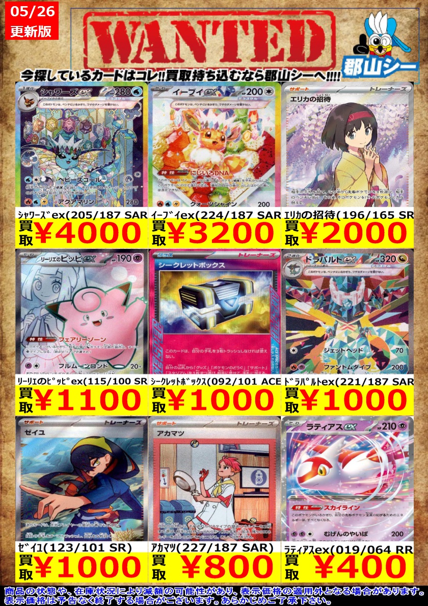 シーガル郡山店ポケカ数量限定お買取り情報更新です!よろしくお願いいたします! ※商品の状態や在庫状況により減額の可能性があり、表示価格の適用外となる場合がございます。 Nのゾロアークex(061/100 RR) ¥100 夜のタンカ ¥150 ロケット団のラムダ ¥150