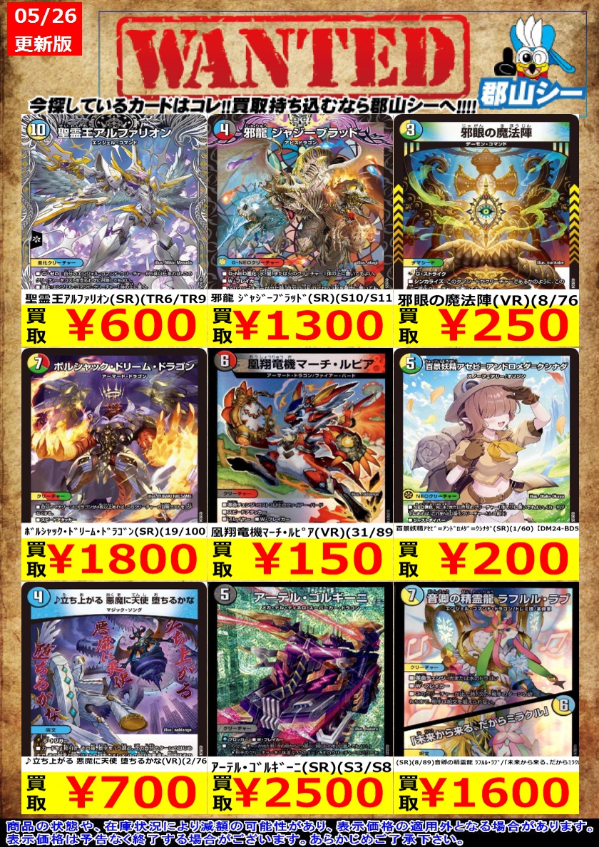 シーガル郡山店デュエマお買取り情報!! ※商品の状態や在庫状況により減額の可能性があり、表示価格の適用外となる場合がございます。 聖霊王アルファリオン(SR)(TR6/TR9) ¥600 邪龍 ジャジーブラッド(SR)(S10/S11) ¥1,300 凰翔竜機マーチ・ルピア(VR)(31/89) ¥150