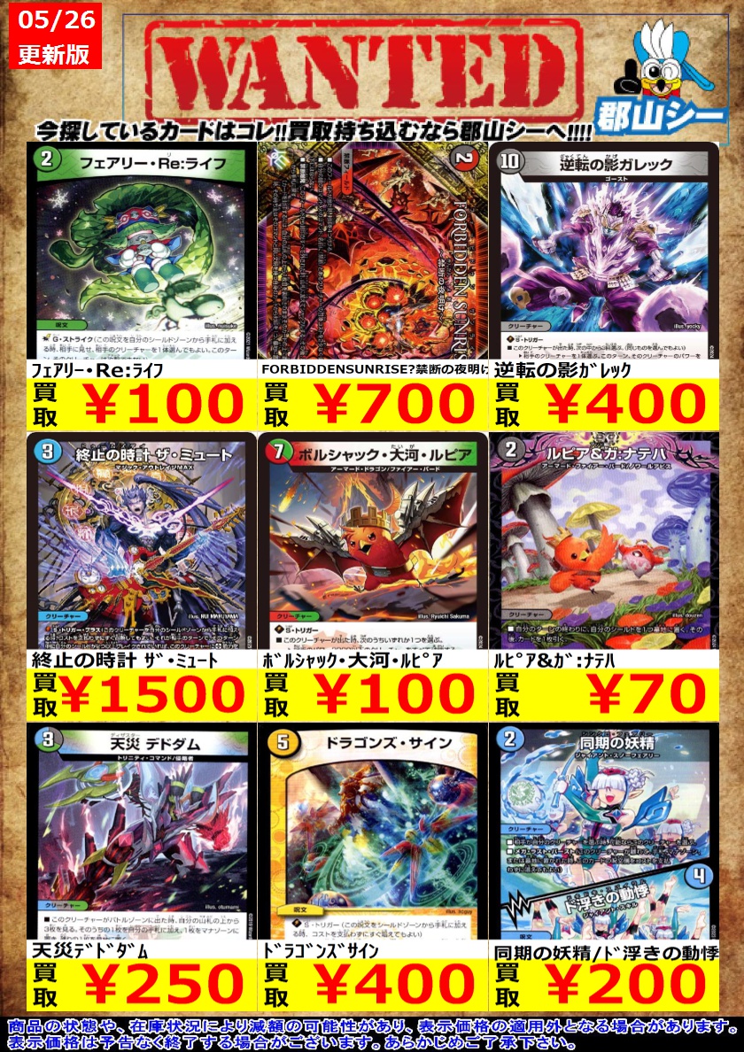 シーガル郡山店デュエマノーマルお買取り情報!! ※商品の状態や在庫状況により減額の可能性があり、表示価格の適用外となる場合がございます。 フェアリー・Re:ライフ ¥100 逆転の影ガレック ¥400 FORBIDDENSUNRISE?禁断の夜明け? ¥700