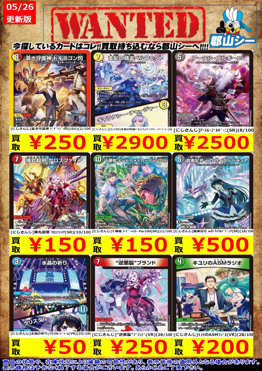 シーガル郡山店デュエマお買取り情報!! ※商品の状態や在庫状況により減額の可能性があり、表示価格の適用外となる場合がございます。 [にじさんじ]ブレイン・スラッシュ(R)(54/100) ¥200 [にじさんじ]アーテル・ゴルギーニ(SR)(8/100) ¥2,500 [にじさんじ]百鬼の邪王門(R)(57/100) ¥50